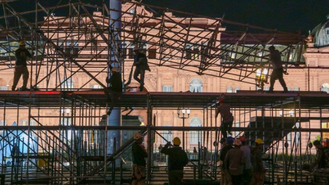 Se instala un gran escenario en la Plaza de Mayo, entre la Pirámide de Mayo y el Monumento a Manuel Belgrano, desde espaldas hasta la Casa Rosada. espero que el inicio del evento mié a las 4 p.m..