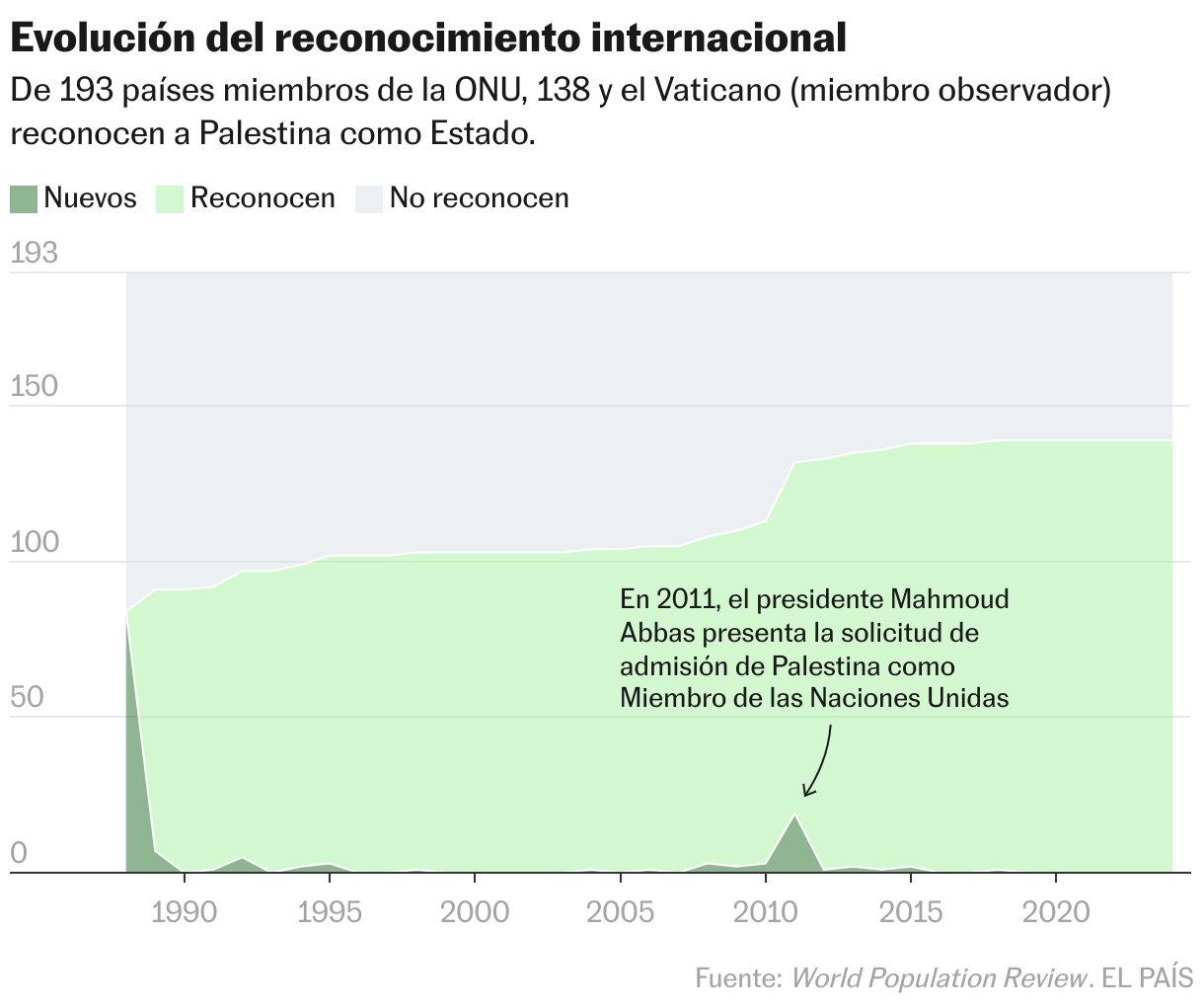 La búsqueda de su reconocimiento como Estado ha sido una de las estrategias de los palestinos para superar el callejón sin salida al que se llegó tras los Acuerdos de Oslo, firmados entre 1993 y 1995. Esos acuerdos no derivaron en el establecimiento de un Estado palestino e Israel aceleró la construcción en los asentamientos. En 1993, 285.000 colonos israelíes vivían en asentamientos ilegales en Cisjordania. Hoy son al menos 700.000, según la ONU.