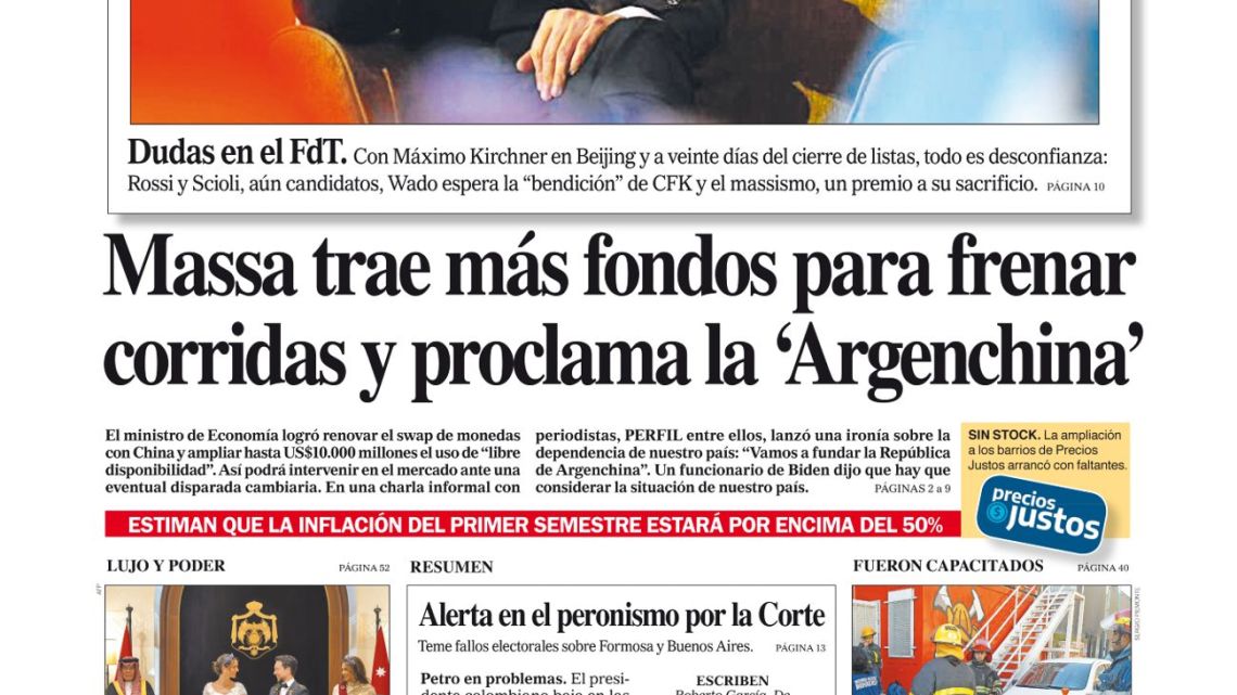 Massa trae más fondos para frenar las corridas de toros proclamó allí la ‘Argenchina’. El Ministerio de Economía ha renovado el intercambio de dinero con China y lo ha incrementado hasta los 10.000 millones de dólares estadounidenses utilizando la «libre disponibilidad». Así podrá intervenir en el mercado ante una eventual disparada cambiaria. En una charla informal con periodistas, PERFIL entre ellos, lanzó una sobria ironía sobre la dependencia de nuestro país: «Vamos a fundar la República de Argentina». Un funcionario de Biden dijo que consideraría la situación del país.